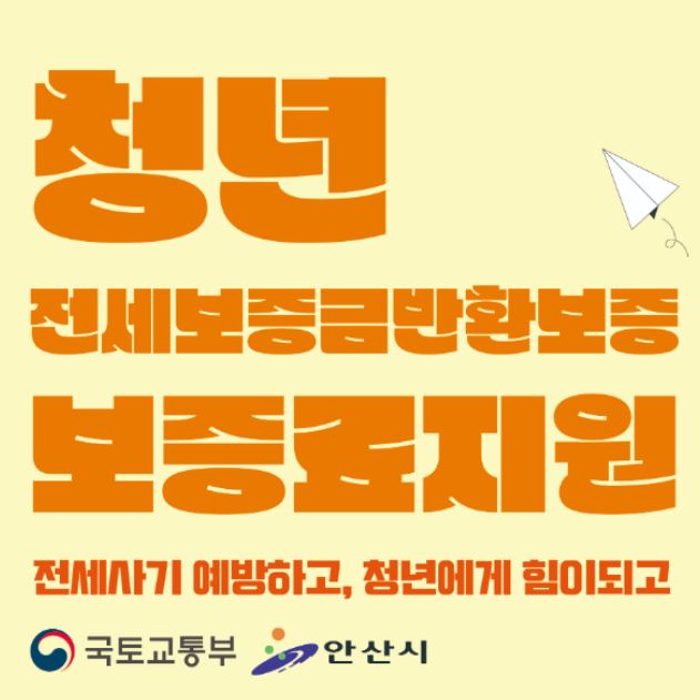 안산시 청년 전세보증금반환보증 보증료 지원사업이 2023년 12월에 마감됩니다. 올해 전세 계약을 맺은 안산거주 청년이라면 얼마 남지 않은 지원사업 기한 내에 전세보증금반환보증 보증료 중 30만 원 지원받으세요!